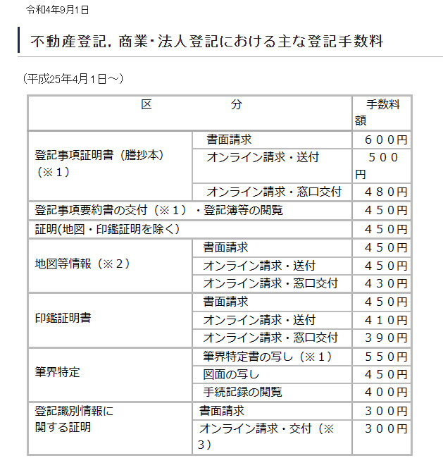 もちろん公図と謄本を取得する際は数百円程度の費用が発生します。また郵送なども対応しており、それぞれ料金が異なるため、下図を参考にしてください。