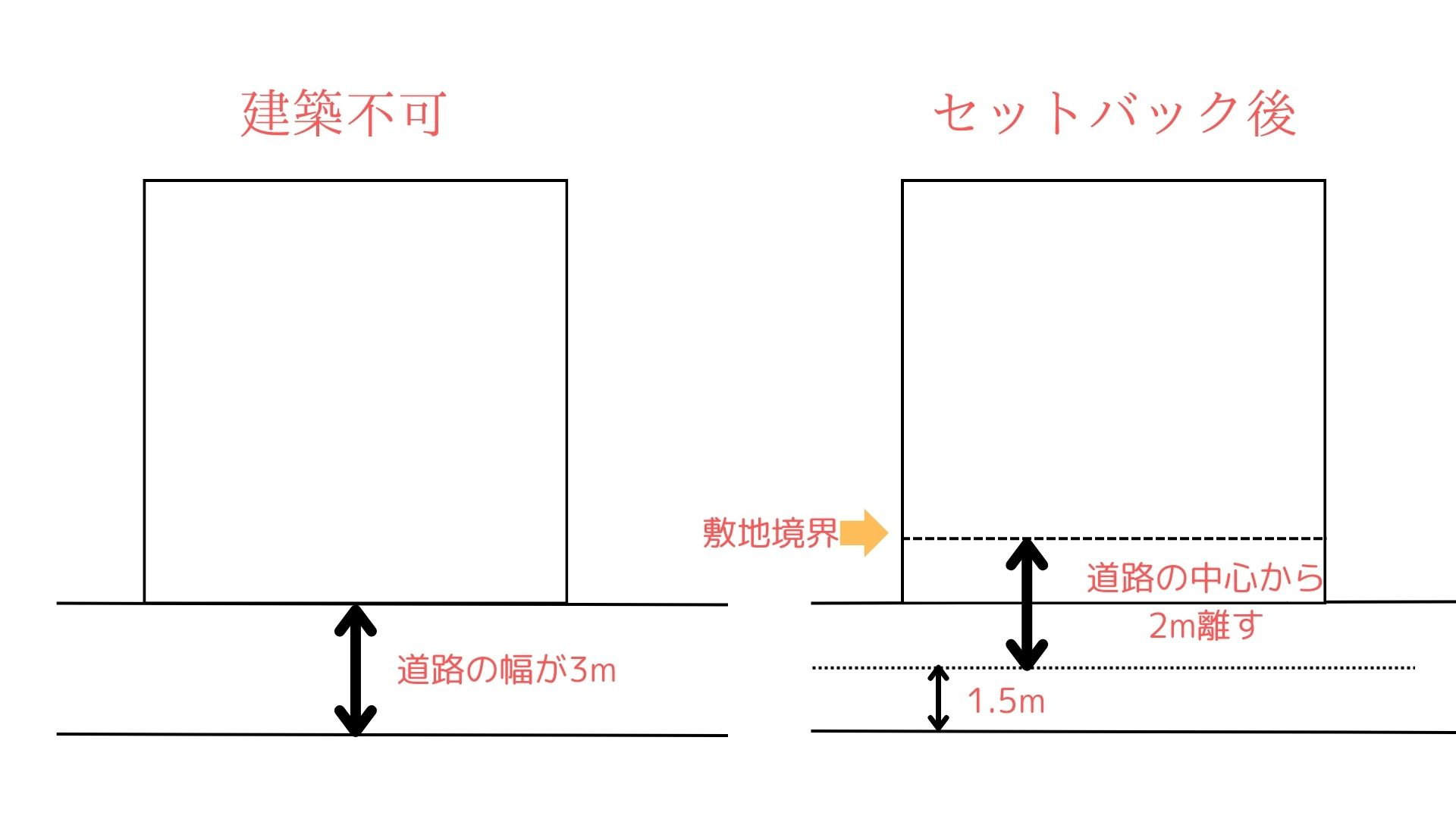セットバックを行えば、接道義務をクリアすることができ、建物を建築することができます。道路後退とも呼ばれ、道路の中心線から2m離れた場所から敷地の境界線を後退させ、道路の幅を確保する方法です。